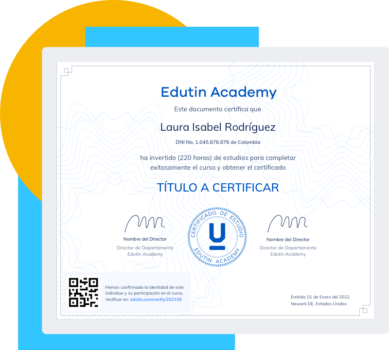 Una vez que completes el curso, Edutin te dará un certificado digital que puedes imprimir y guardar como prueba de que completaste el curso. En este certificado estará tu nombre completo y las horas que le dedicaste al curso. También tendrás las firmas de los directores de la organización y esto le otorga una validez internacional ante cualquier empresa.