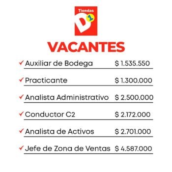 Tiendas D1 ofrece una amplia variedad de oportunidades laborales en diferentes áreas, ideales tanto para personas con experiencia como para quienes buscan su primer empleo. Entre los principales puestos disponibles se encuentran: